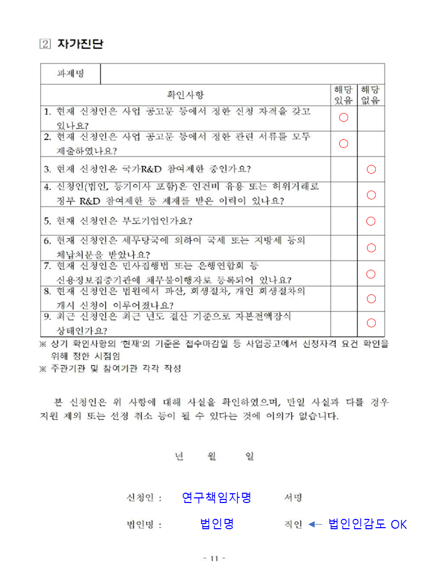 자가진단표는 사업을 수행하기 전에 자격이 있는지 체크하는 부분입니다. 아래 처럼 표시하시면 되고, 아래와 같지 않다면 신청자격에 문제가 있는 것이니, 해당 문제를 해결해야 합니다. 신청인에는 연구책임자명을 넣고 서명 (개인 도장도 가능하며, 인감도장이 아니어도 괜찮습니다.) 하시면 됩니다. 법인명에 직인 날인을 하도록 되어 있는데, 직인을 따로 만들지 않은 기관에서는 법인인감을 사용해도 무방합니다.