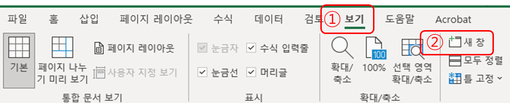 주의: 파일 이름을 바꾸면 창 기능이 활성화 되지 않습니다. 파일이름을 바꾸고 나면 엑셀에서 보기 메뉴 -> 새창을 클릭하면 하나의 엑셀파일을 두개의 창으로 띄울 수 있습니다. ![]() |