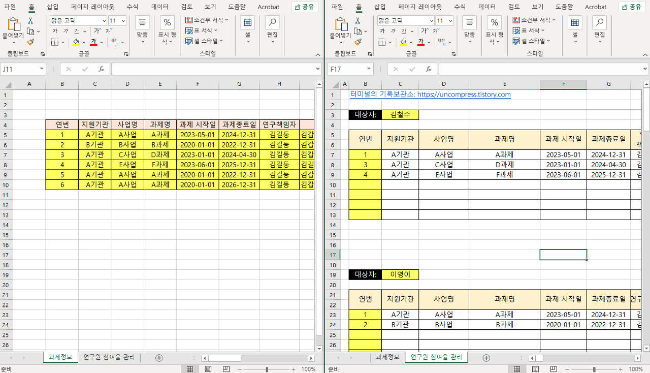 기본적으로 아래 있는 템플릿은 노란색 부분을 입력하시면 됩니다. 두가지 시트가 있는데, 과제정보 시트와 연구원 참여율 관리 시트입니다. 해당 파일을 열면 각각의 시트가 한번에(?) 열립니다. 듀얼 모니터를 사용하신다면 1번 모니터에는 과제정보 시트를 띄우고, 2번 모니터에는 연구원 참여율 관리 시트를 띄워 놓으면 편하지 않을까 싶어서 창 기능을 활용하였습니다.