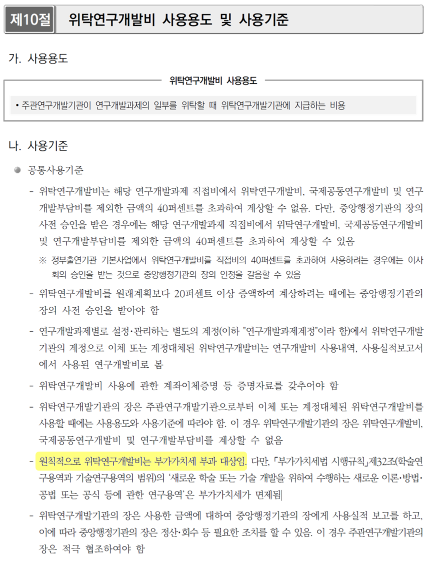 아래는 국가연구개발혁신법 메뉴얼 189페이지 입니다. (해당 페이지에 위탁연구개발비가 부가가시세 부과 대상임을 명시하고있습니다. )