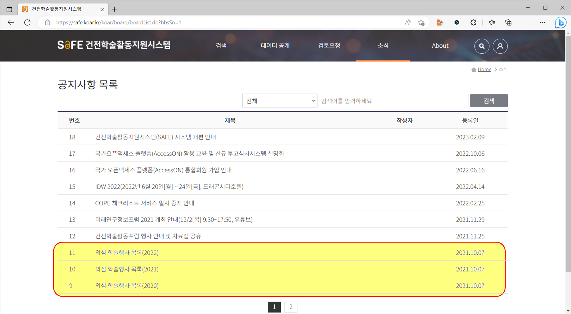 위 사이트를 클릭하면 아래와 같은 화면이 나오며, 페이지 우측 하단을 보면 부실 학술행사와 데이터 공개 메뉴가 있습니다.