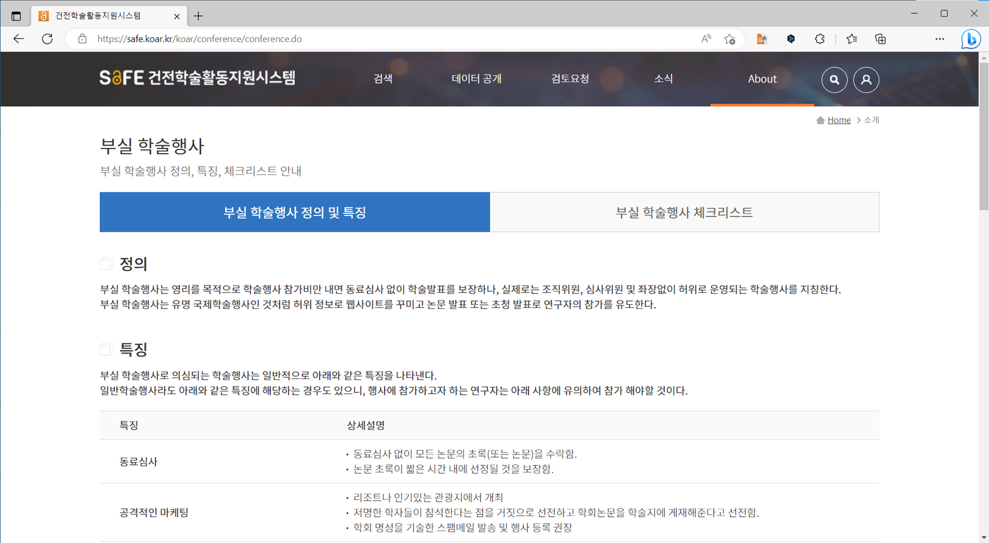 위 사이트에서 부실 학술행사 메뉴를 클릭하면 아래와 같은 부실 학술행사 정의 및 특징과 부실 학술행사 체크리스트를 확인할 수 있습니다.