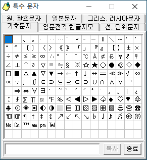 특수문자 입력기를 이용해 원하는 특수문자를 더블클릭하면 아래 창에 해당 특수문자가 입력됩니다. 특수문자가 입력되면 복사버튼을 누르고 한글 워드프로세서에 붙여넣기 합니다.