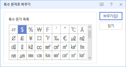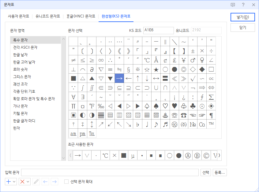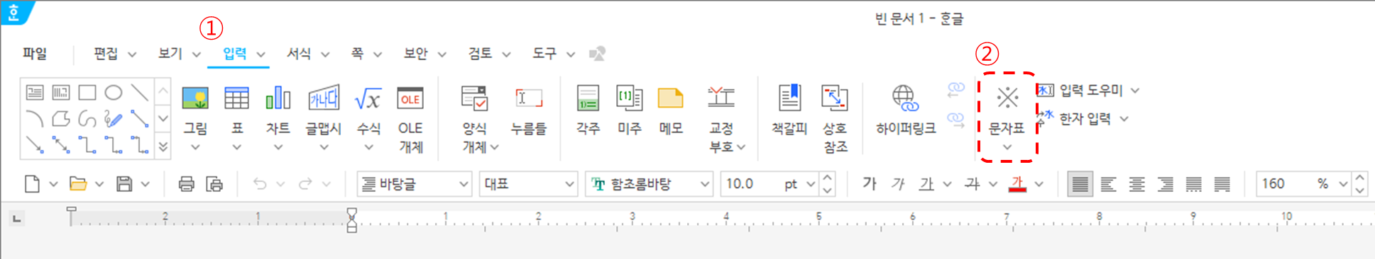 입력 메뉴를 클릭하면 리본메뉴 우측에 문자표 메뉴를 통해 문자표 팝업창을 띄울 수도 있습니다.