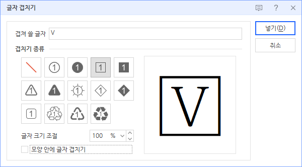 여기서 겹쳐쓸 글자에 V를 누르면 아래와 같은 화면이 나타나며, 넣기(D)를 클릭하면 해당 내용이 한글 워드프로세서에 반영됩니다.