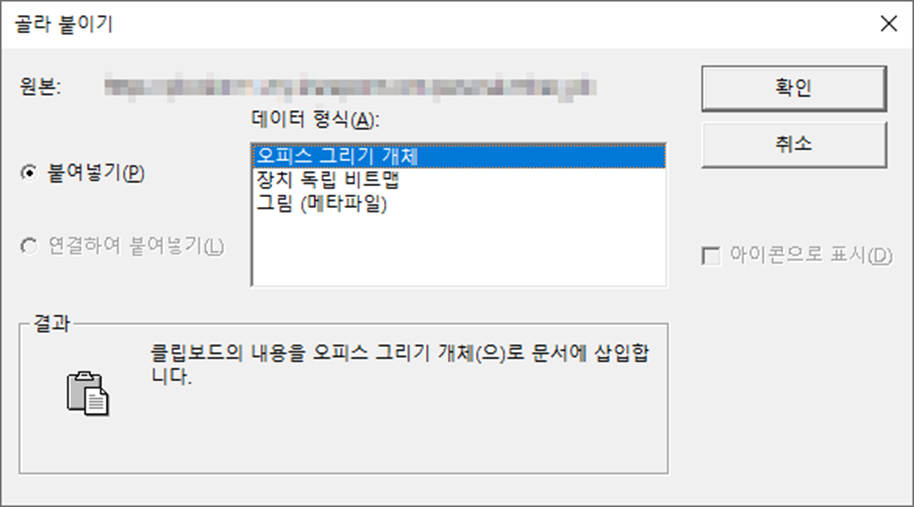 위 예시에서는 3가지 옵션이 나타났는데, 복사된 형태에 따라서 오피스 그리기 개체나 그림 (메타파일) 데이터 형식은 나타나지 않을 수 있습니다.