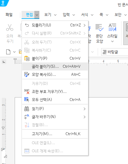 한글 2022에서도 이전 버젼들과 마찬가지로 골라 붙이기를 제공합니다. 편집 → 골라 붙이기를 통해 골라 붙이기 팝업창을 띄울 수 있으며, 단축키 Ctrl + Alt + V 를 이용하여 골라 붙이기 팝업창을 띄울 수 있습니다.