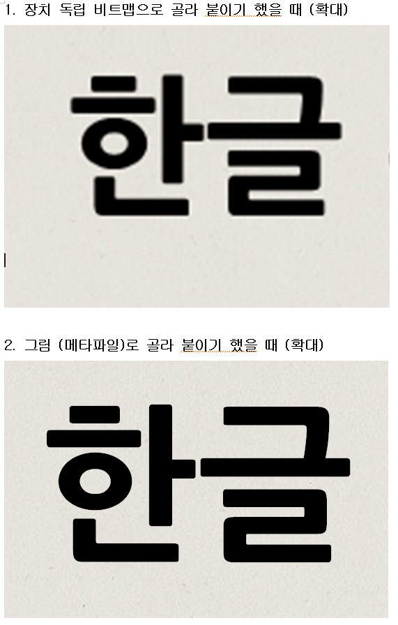 위에서 보시는 바와 같이 그림의 크기가 작을 때는 큰차이가 없지만, 그림을 확대하면 장치 독립 비트맵의 경우 글씨가 뿌옇게 보이는 반면 (보통은 깨진다고 하죠), 그림 (메타파일)로 골라 붙이기를 하면 글씨가 깨짐 없이 깔끔하게 확대되는 것을 알 수 있습니다.