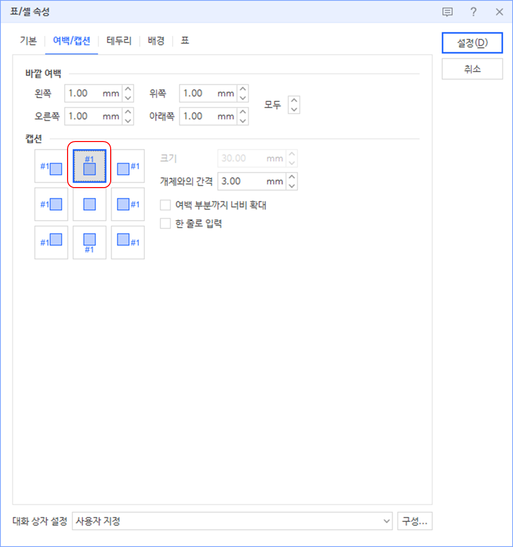 여백/캡션 탭을 클릭한 뒤, 캡션 위치를 표 위로 선택한 뒤, 설정을 누릅니다.