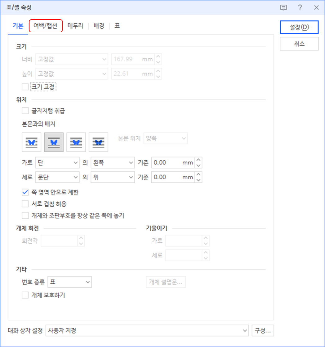 표/셀 속성 창이 나타나면 여백/캡션 탭을 클릭합니다.