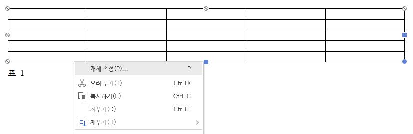 표를 클릭한 뒤, 마우스 우클릭 → 개체 속성을 클릭하거나, 표를 클릭한 뒤 p 를 눌러 표/셀 속성 팝업창을 띄웁니다.