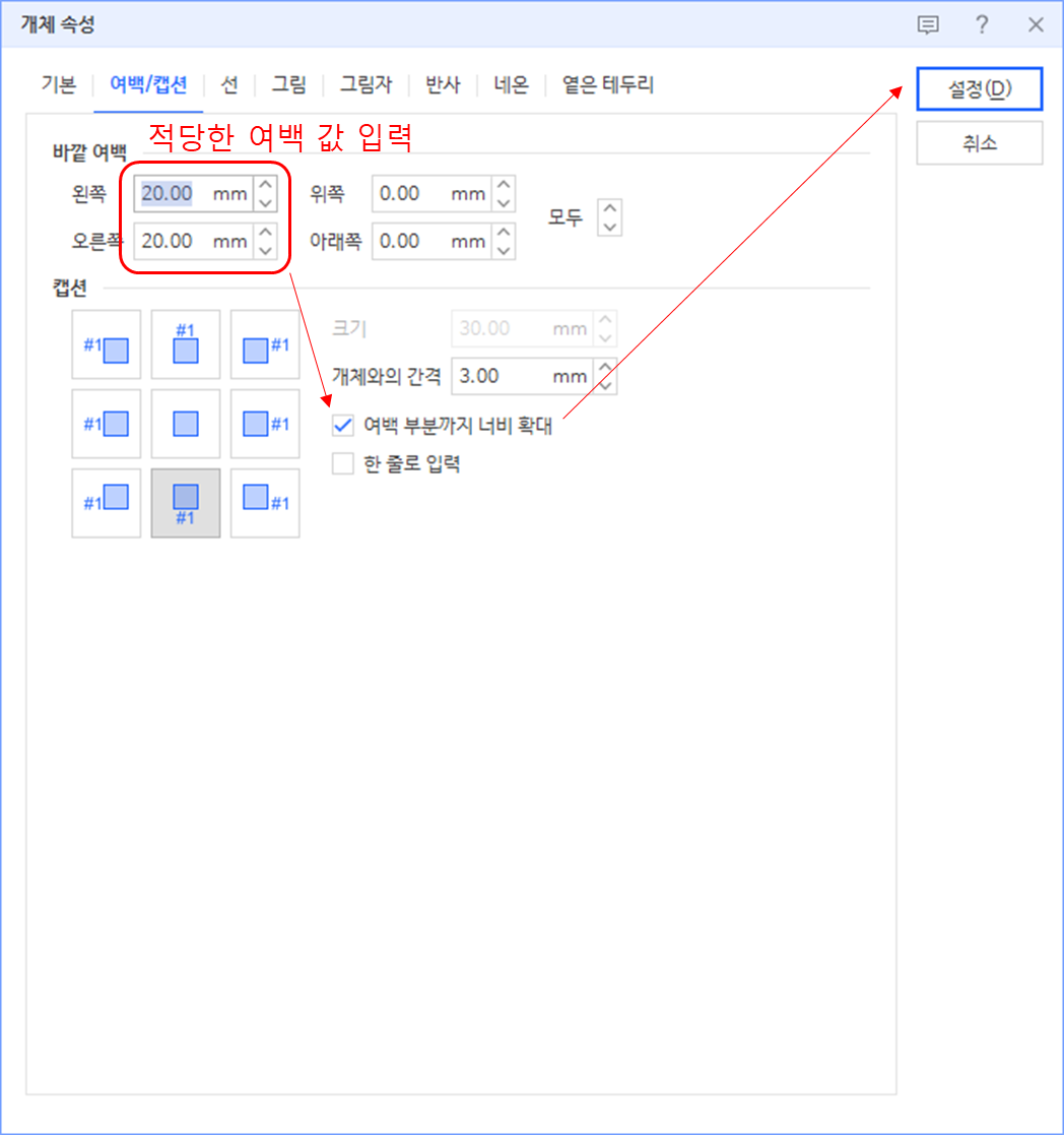 여백 부분까지 너비 확대 적용을 위하여 표/셀 속성 (그림/표 클릭 후 마우스 우클릭 → 개체 속성을 클릭)에 들어간 뒤, 여백/캡션 탭에 들어가서 적당한 여백을 적용한 뒤, 여백 부분까지 너비 확대를 클릭하고 설정을 누릅니다.