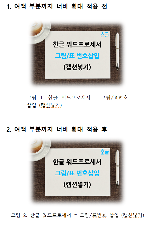 캡션 기능 사용 도중에 그림 너비를 넘어가서 두줄로 표시 될 경우 이를 한줄에 표현하고 싶을 때 여백 부분까지 너비 확대를 사용할 수 있습니다. 좀더 깔끔한 캡션 표현이 필요할 때 여백을 설정한 뒤, 여백 부분까지 너비 확대를 사용할 수 있습니다.