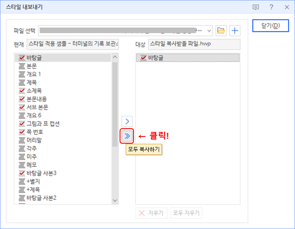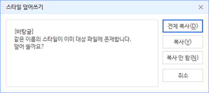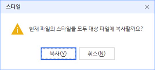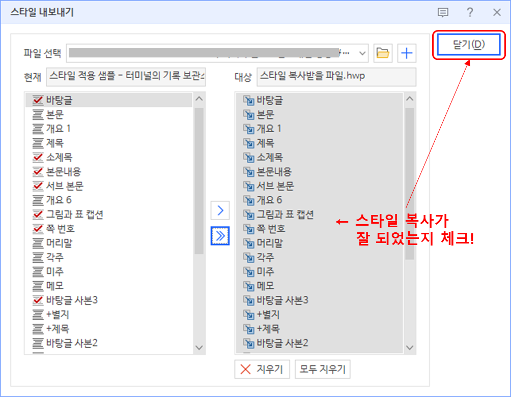 전체 복사 또는 복사를 누르고 나면 아래 그림고 같이 스타일이 복사된 화면을 볼 수 있습니다. 스타일이 복사된 것을 확인 하신 뒤, 닫기를 누릅니다.