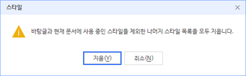 스타일을 적용할 파일을 열면 아래 그림과 같이 대상 창에 파일 이름이 나타나며, 스타일 목록이 나타납니다. 스타일 목록이 나타나면 모두 지우기를 클릭하여 스타일을 모두 지워줍니다.