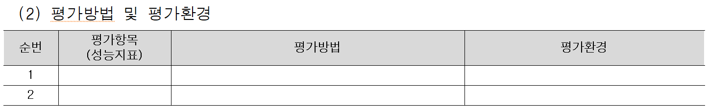 결과물의 성능지표를 넣었다면, 평가방법 및 평가 환경도 함께 작성하는 것이 좋으며 양식은 아래와 같다. 평가방법은 표준 방법 (ISO, ASTM 등)이 있다면 표준 방법을 간략하게 제시하고, 평가 환경은 공인시험, 자체평가, 제3자 전문가 입회화 평가 등으로 간략하게 기재하면 된다.