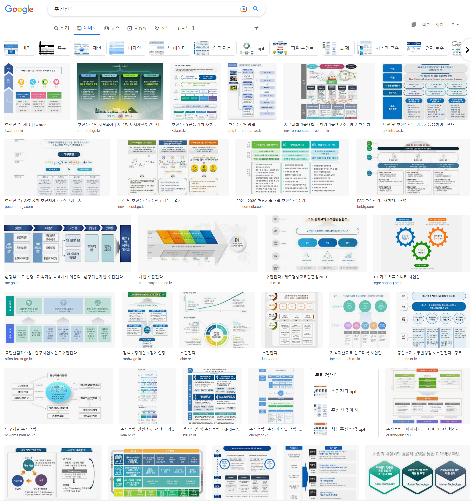 앞서 이야기한 바와 같이, 두괄식으로 작성하면 심사위원들이 말하고자 하는 바를 빠르게 캐치할 수 있으므로, 이 전략을 구사하는 것이 좋다. 이를 위한 첫번째 팁으로, 구글에서 추진전략을 검색한 뒤, 이미지 검색을 하면 추진전략과 관련된 다양한 예시들을 확인할 수 있다. 마음에 드는 이미지가 있다면 가져와서 그림을 그린다.