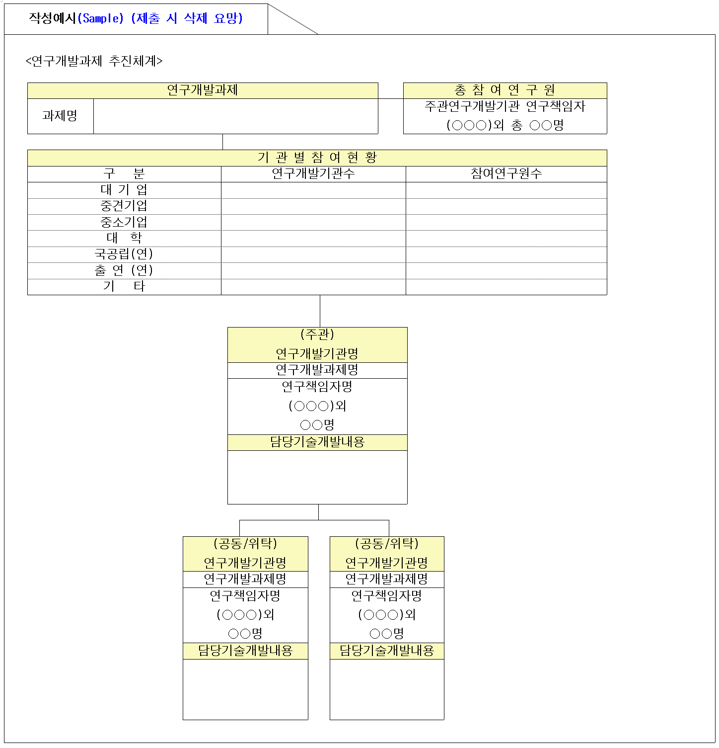 사업에 따라서 아래와 같이 샘플을 제공하는 경우가 있는데 (많은경우 정부 R&D 사업계획서 내에 샘플을 제공한다.) 샘플을 제공하면 샘플에 맞추어 작성하면 된다. 딱히 제시된 예시가 없다면 개발 단계별 순서도 정도를 작성하면 된다.