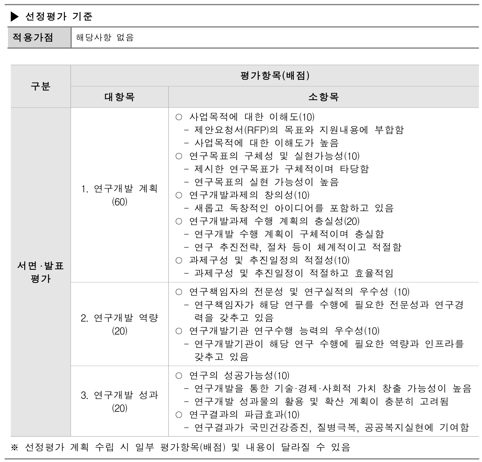 보건복지부의 보건의료기술연구개발사업은 제안요청서 (Resquest for proposal, RFP)내에 평가 항목 및 배점을 안내해 주고 있습니다. (보건복지부 타 사업도 비슷하리라 생각됩니다.)